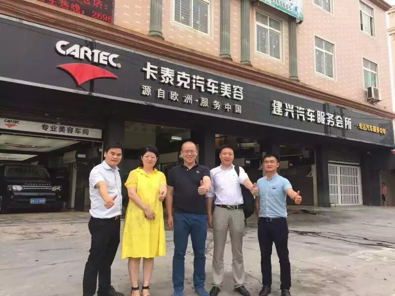 (中:卡泰克亚太地区总裁厉特博 右二:卡泰克中国大区经理郭耀宗 在卡泰克汽车美容建兴服务会所门店前合影)